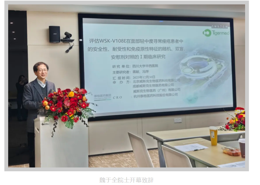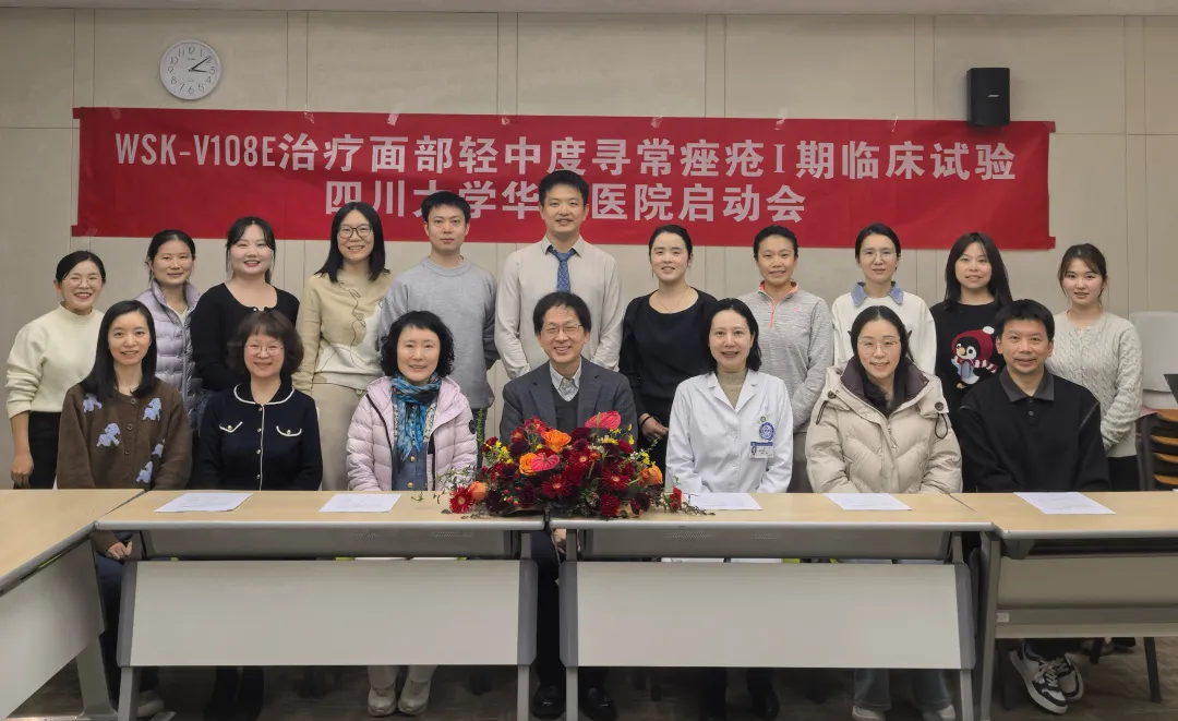 2025年12月30日,由威斯克生物研发、四川大学华西医院蒋献、冯萍教授牵头开展的“评估 WSK-V108E 在面部轻中度寻常痤疮患者中的安全性、耐受性和免疫原性特征的随机、双盲、安慰剂对照的Ⅰ期临床研究“项目启动会在四川大学华西医院顺利召开。与会专家围绕研究方案设计、执行细节及临床意义展开了热烈而深入的交流,共同描绘了“免疫治痘,精准干预”的创新蓝图。