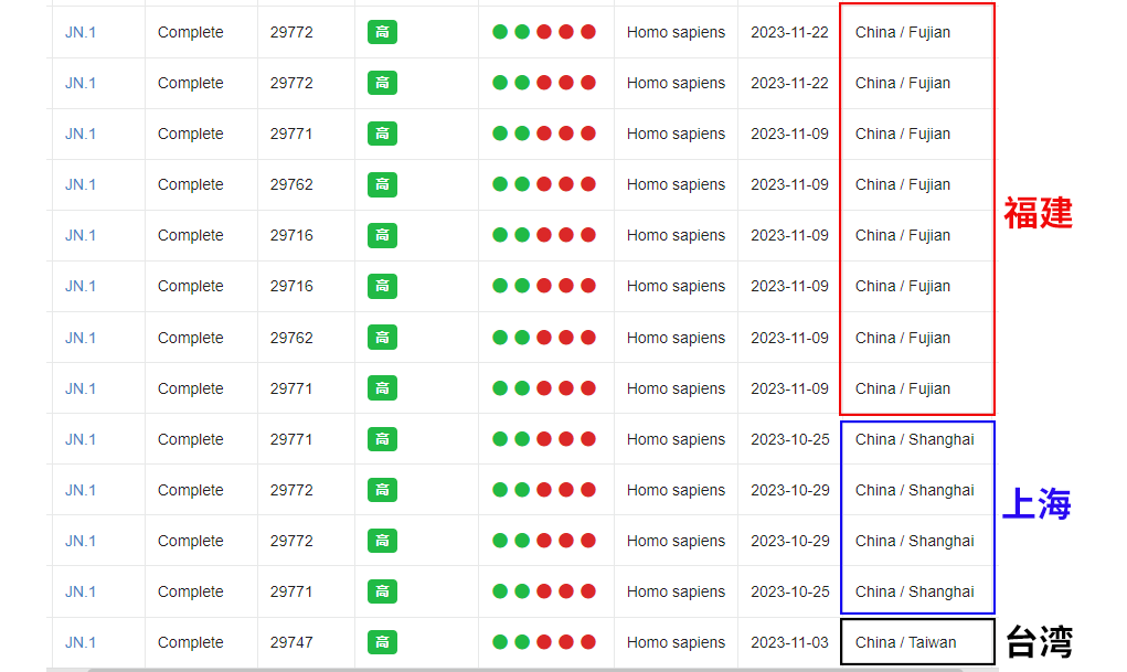 此外,英国、法国、葡萄牙、西班牙、荷兰、冰岛等多个国家均有JN.1相关病例报告。健康时报根据国家生物信息中心数据查询,今年10月、11月JN.1在上海、福建、中国台湾报告的病例中检出。截图自国家生物信息中心网站