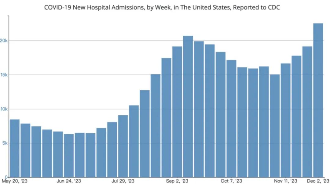 本文来源:疫苗中国当地时间12月8日,美国疾控中心首次将“新冠变异株JN.1”单独纳入新冠临近预报,并称JN.1是目前美国增长速度最快的新冠变异株。截至当日,美国疾控中心预估计JN.1占美国流行变异株的15-29%。而在10月底时,JN.1只占美国新冠变异株的不到0.1%,可谓增势明显。数据显示,一周时间(12月2日-8日),美国新冠住院患者人数超过了2万人。图片截图自美国疾控中心